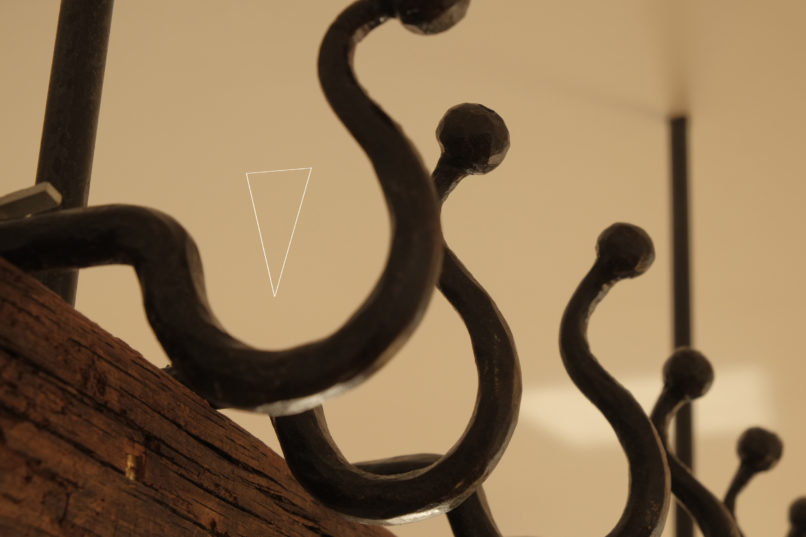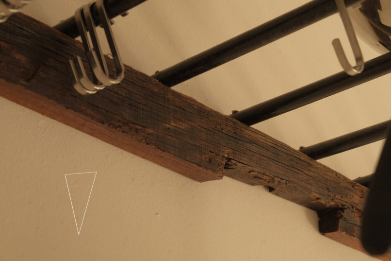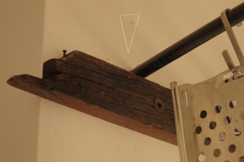 das hängeregal, bestehend aus abschnitten alter fachwerkhaus-balken und handgeschmiedeten vorhangstangen der schongauer grundschulturnhalle. …