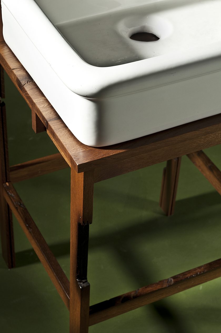 ein waschtrog, eines alten bauernhauses und abschnitte, alter fachwerkhaus eichenbalken. da der waschtisch rückseitig an der wand befestigt ist, konnten auch filigranere bereiche verwendet werden.